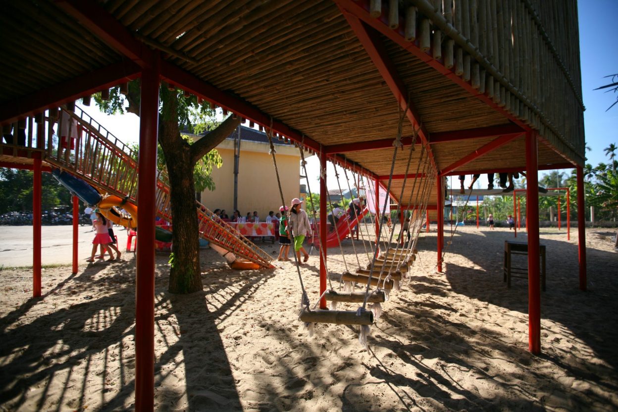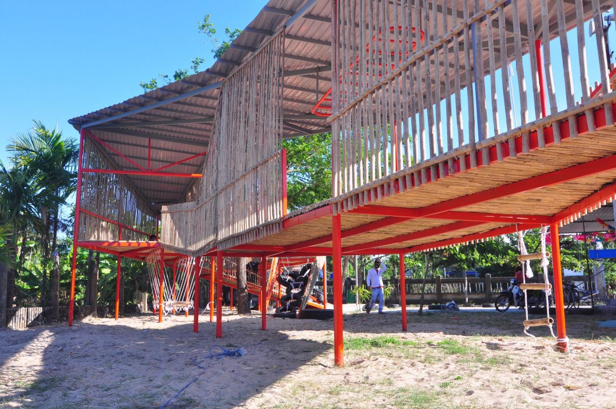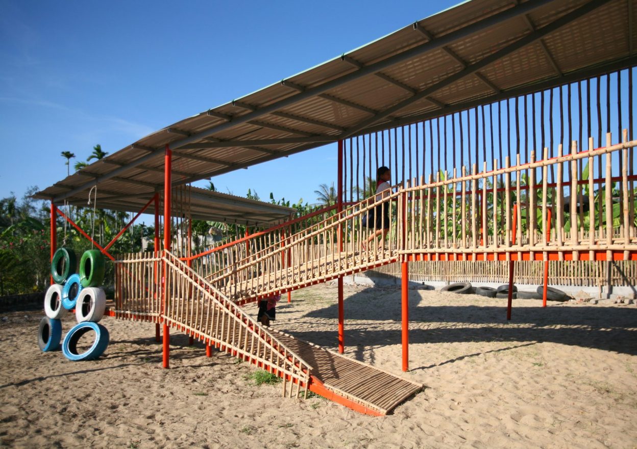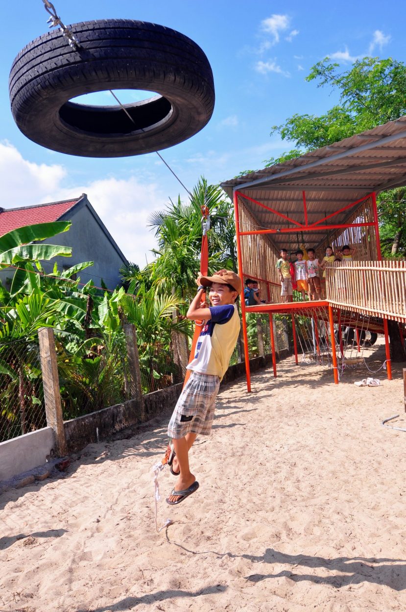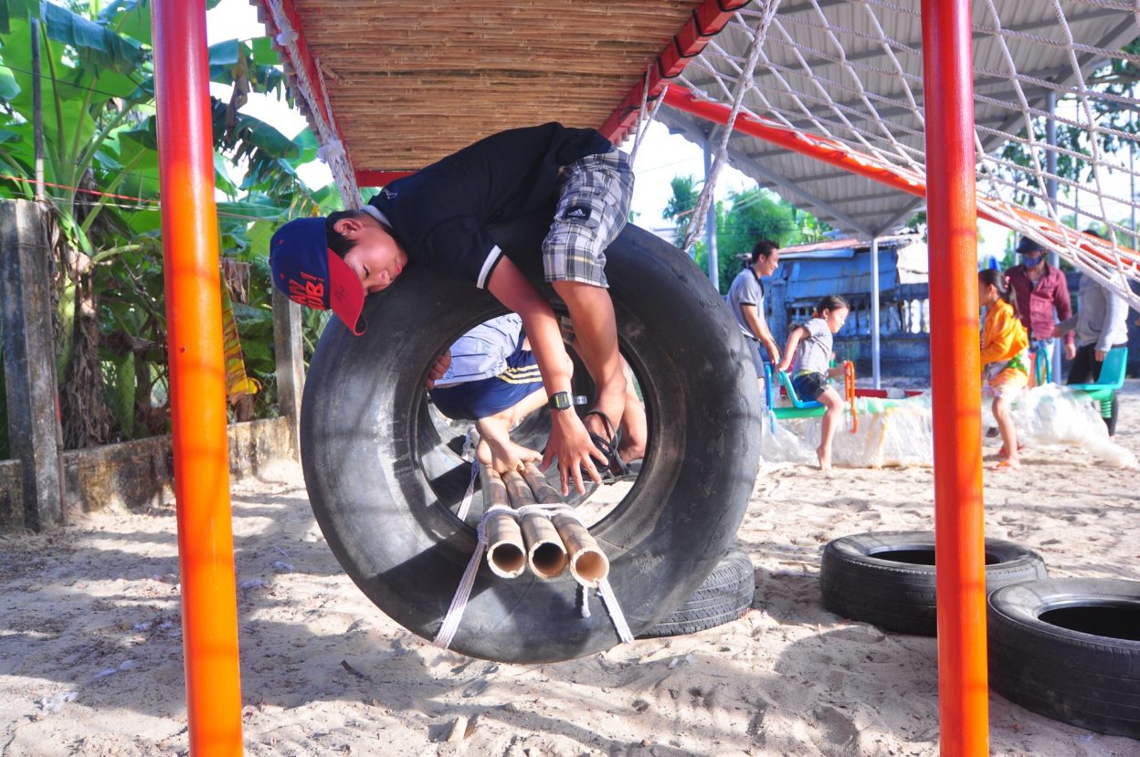 Vật liệu sử dụng là khung sắt kết hợp tầm vông và mái tôn và các vật liệu phế thải như lốp xe ô tô để làm thành đồ chơi cho trẻ em.