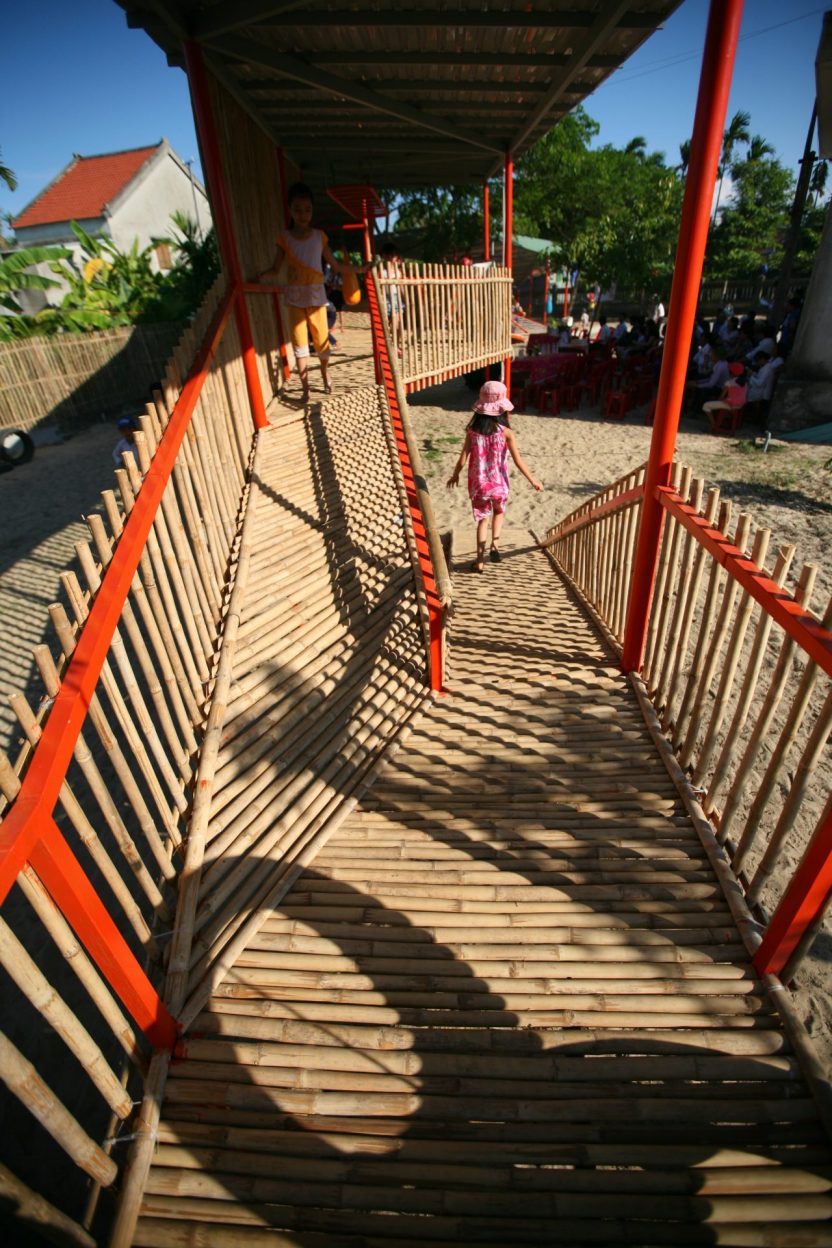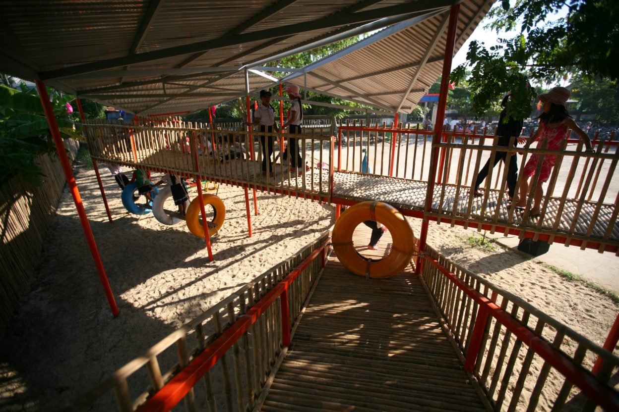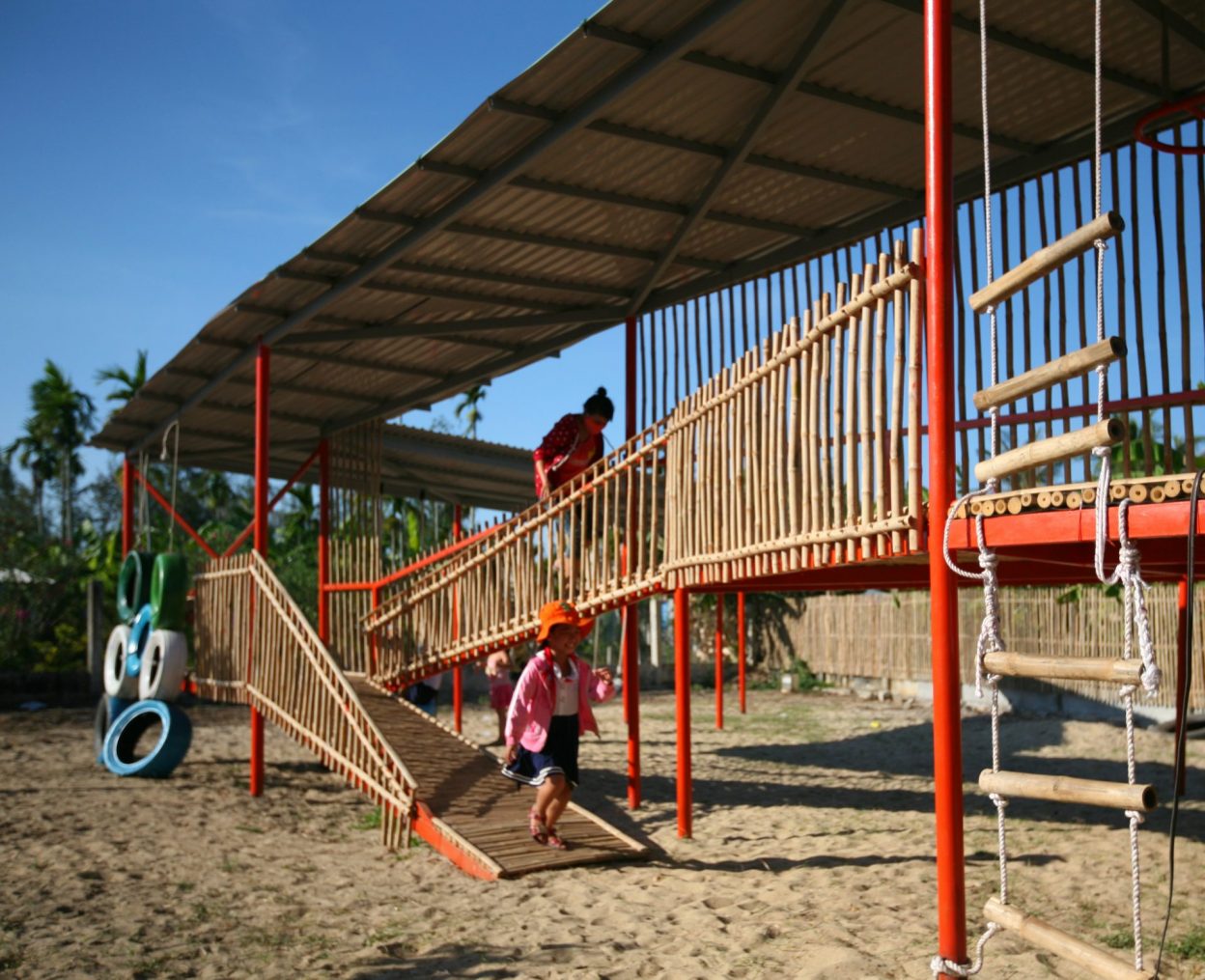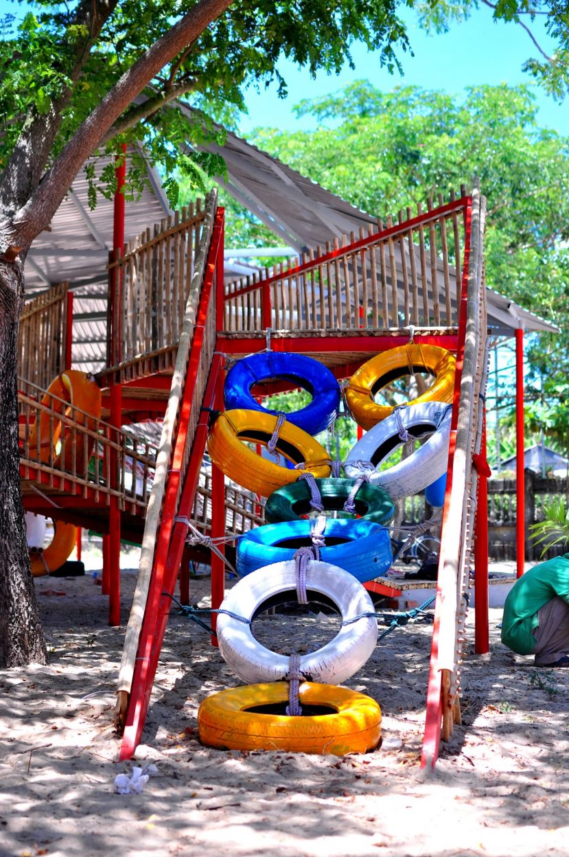 Vật liệu sử dụng là khung sắt kết hợp tầm vông và mái tôn và các vật liệu phế thải như lốp xe ô tô để làm thành đồ chơi cho trẻ em.