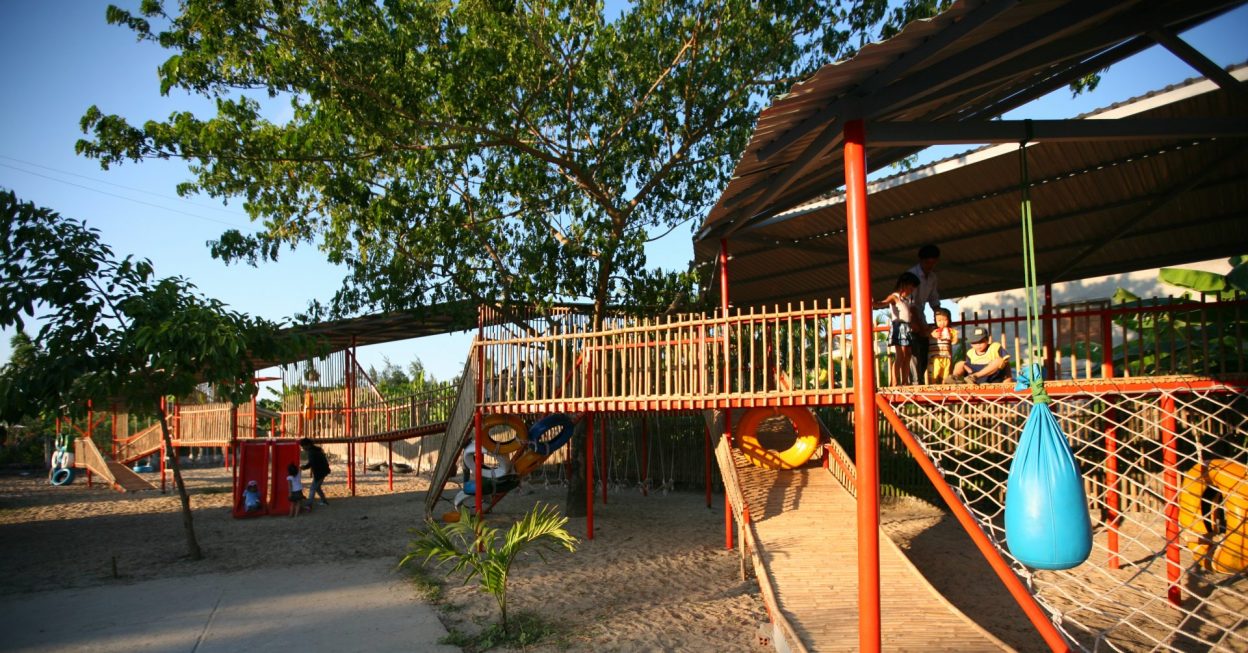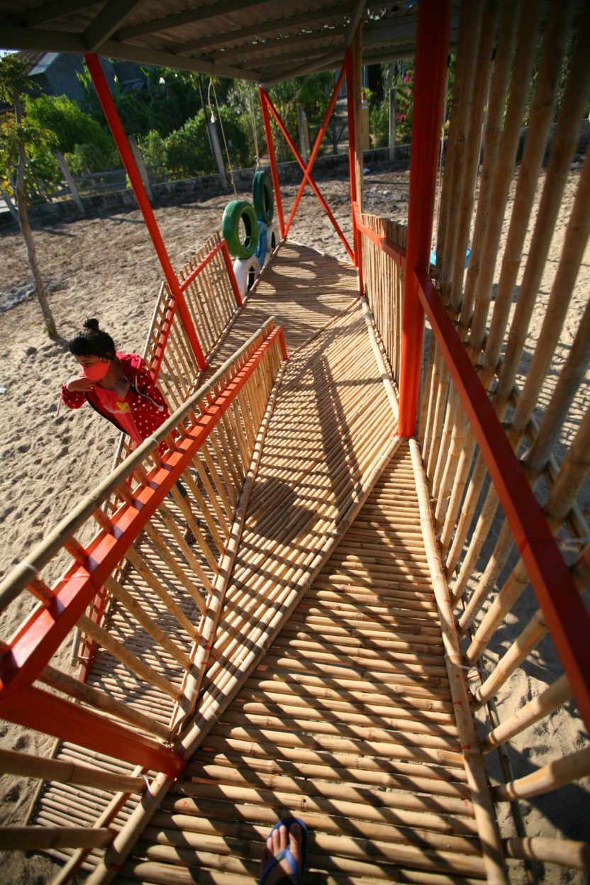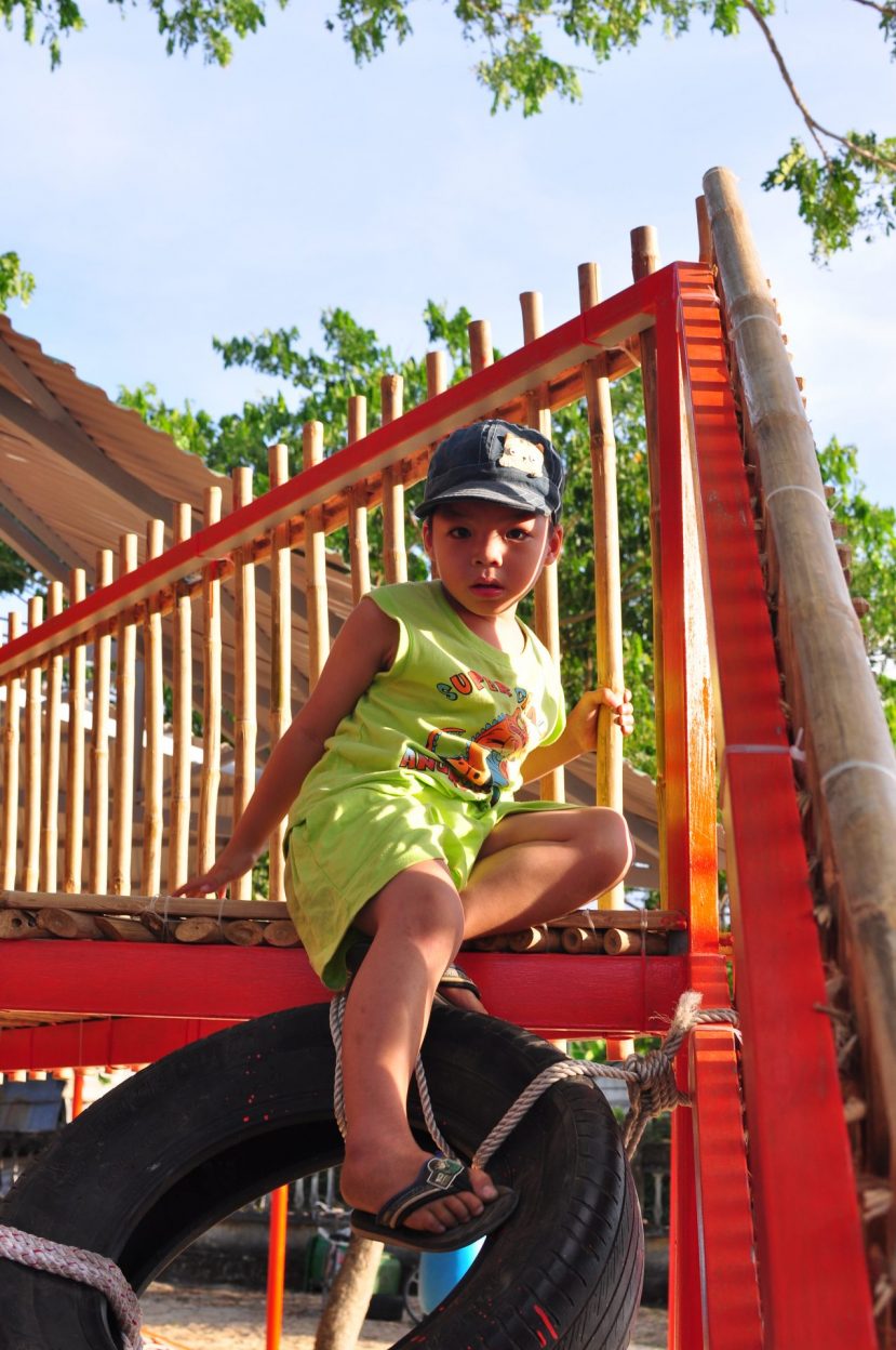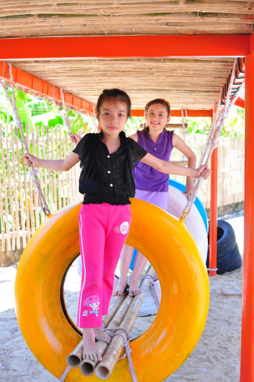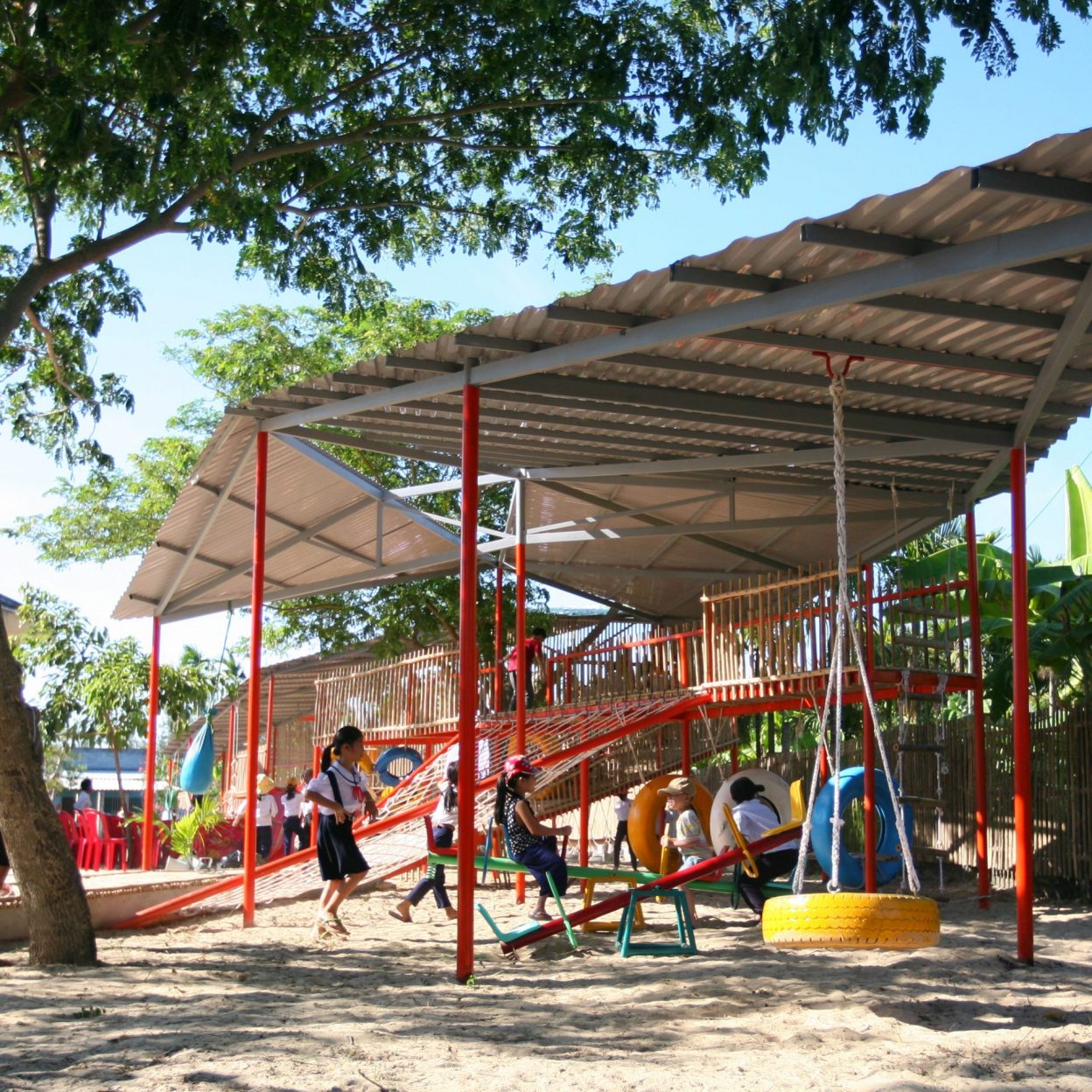 Vật liệu sử dụng là khung sắt kết hợp tầm vông và mái tôn và các vật liệu phế thải như lốp xe ô tô để làm thành đồ chơi cho trẻ em.