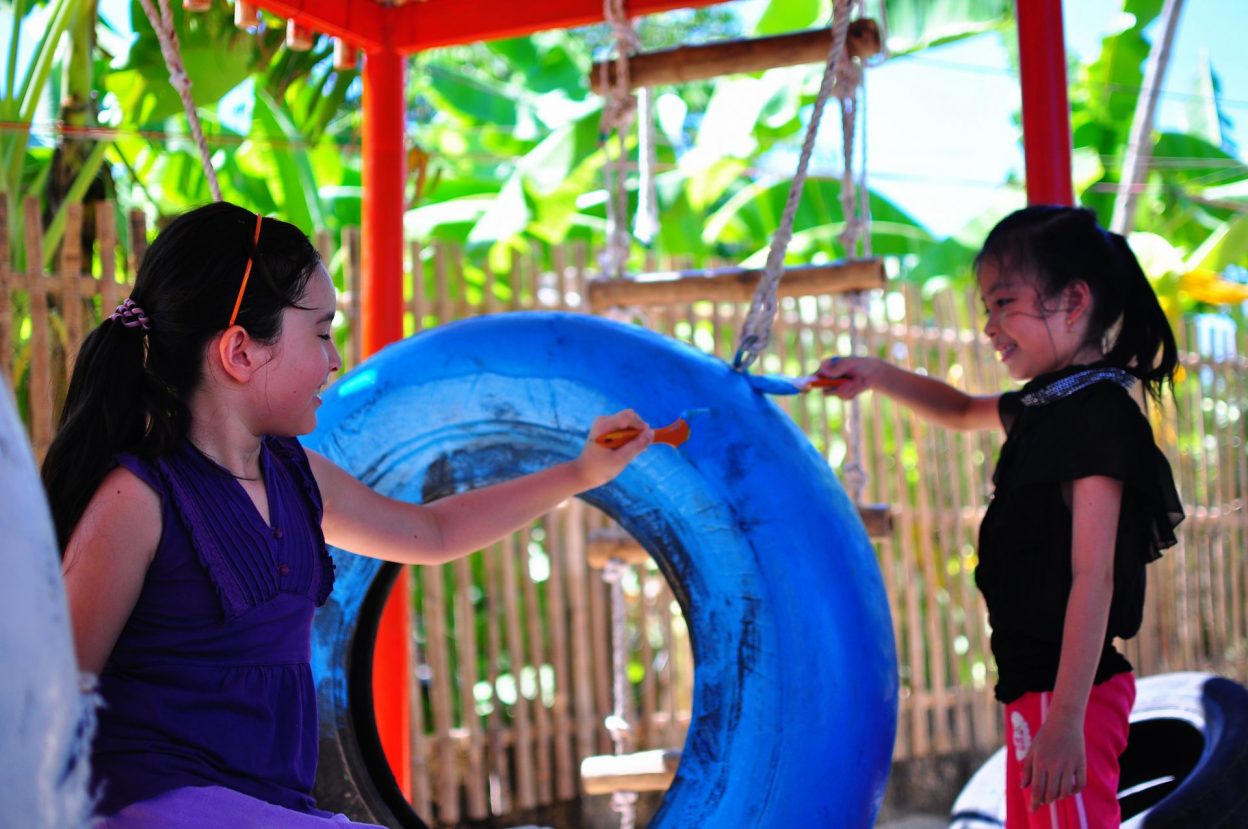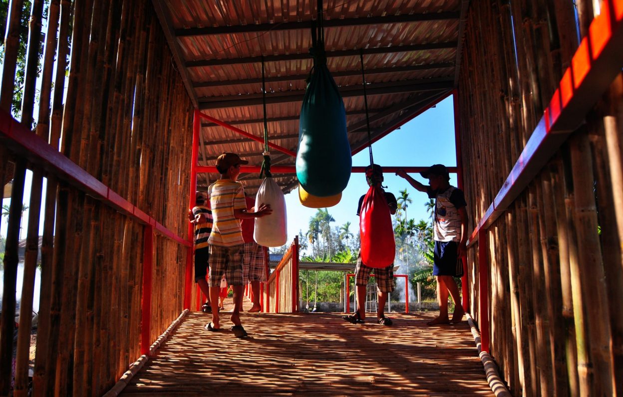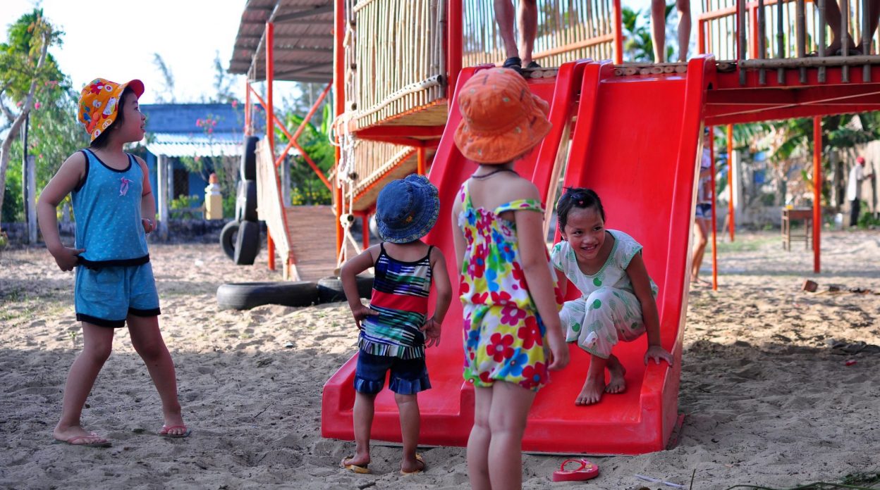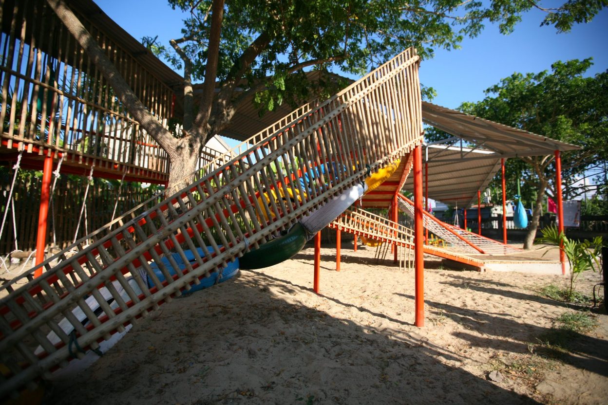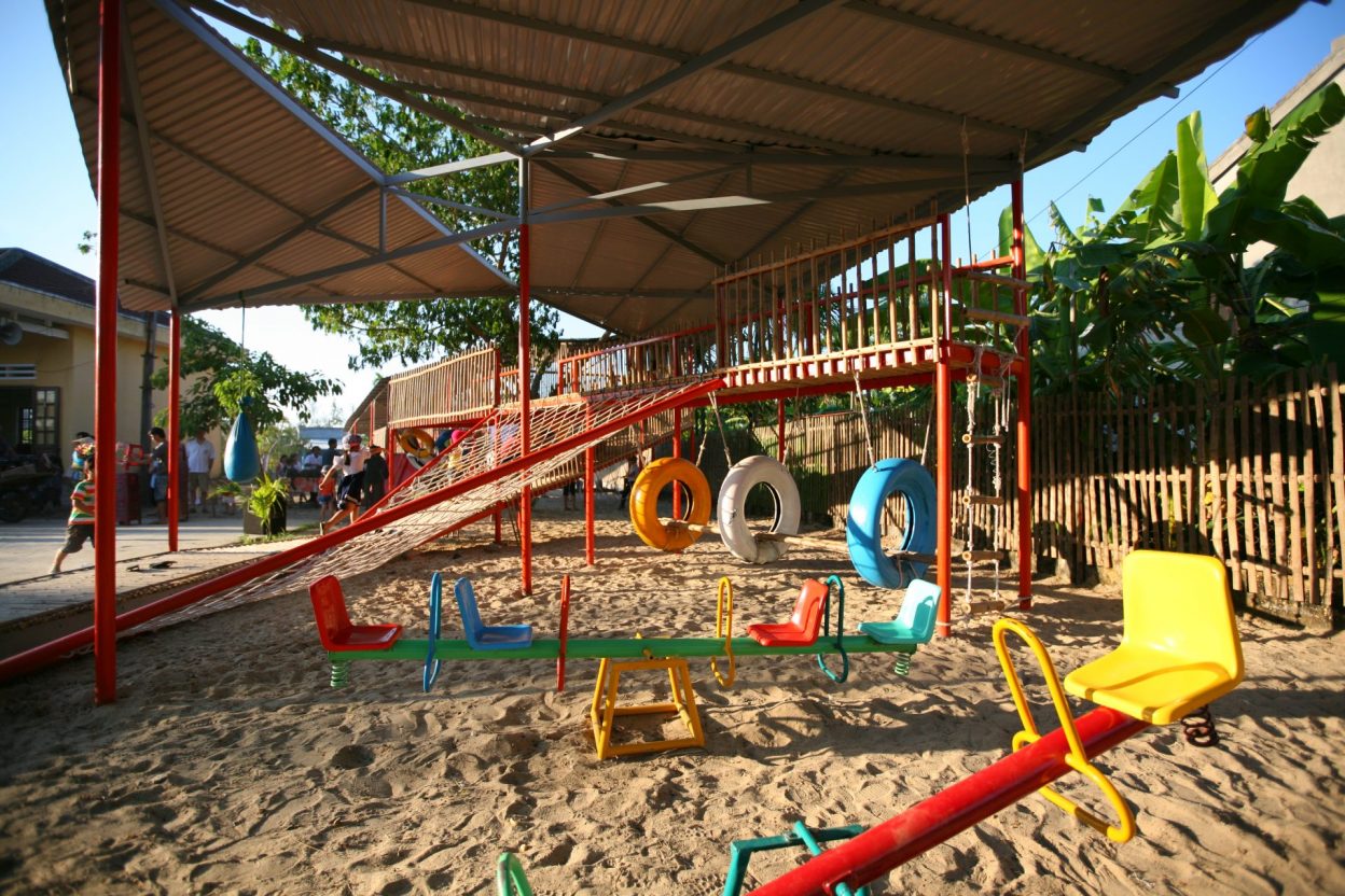 Vật liệu sử dụng là khung sắt kết hợp tầm vông và mái tôn và các vật liệu phế thải như lốp xe ô tô để làm thành đồ chơi cho trẻ em.